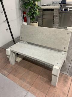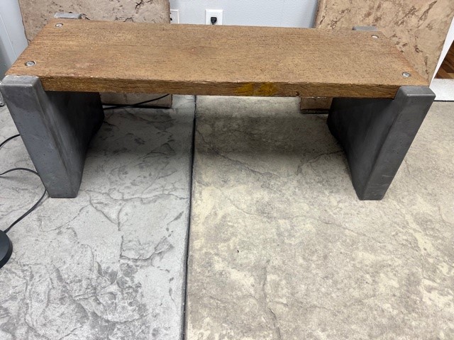 Bench B03. Here is an example of a large bench: Charcoal seat and back / Legs Concrete Gray Dimensions: 48” L x 2” Thick x 16” W / Bench stands 33 1/8 “ Tall x 31” Wide. Concrete used is a 5,000 psi with all necessary rebar for reinforcement. This bench has been sealed with a high quality Solvent Based Acrylic sealer.Bench B06. Small bench: Charcoal Legs / Sienna Brown Barn-Wood Seat Dimensions: Seat: 48” L x 2” H x 16” W / Bench stands 18” tall / Concrete used is a 5,000 psi with all necessary rebar for reinforcement.