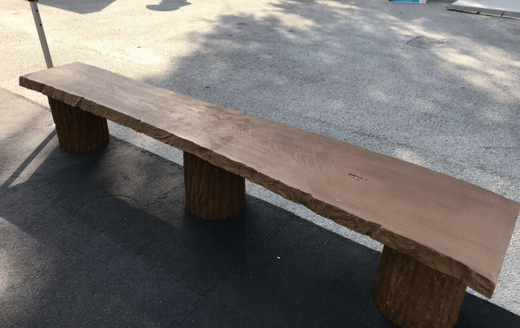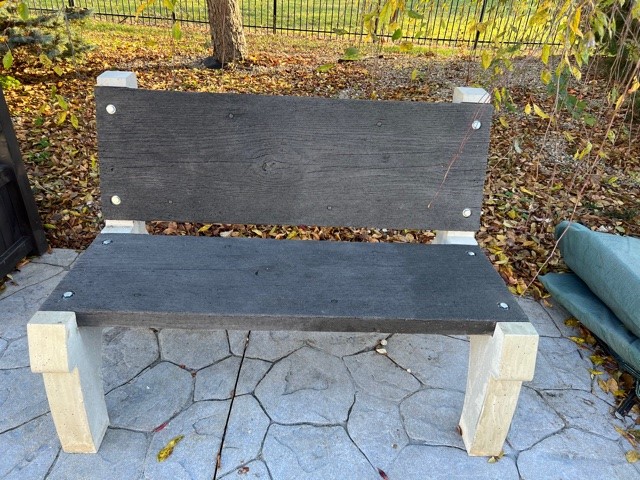Bench B02. Large Bench: Colors used: Autumn Oak with Charcoal accents. Water base penetrating sealer. Also located at the Lions Club location in New Palestine, Indiana.Bench B05. Live Edge Ash (concrete) bench poured with a 5,000 psi mix , with 1/2” rebar, Sienna integral color with Walnut accents . The bench is sitting on three bark textured pedestals.