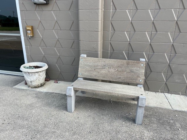 Bench B01. Large Bench, Small Barrel Table, Log Top Wrought Iron table, can all be seen at Lions Club in New Palestine, Indiana.Bench B04. Large bench, Concrete gray with water-based sealer.